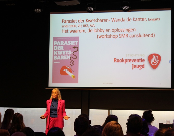 Na een inleiding van dagvoorzitter Philip Elders startte Wanda de Kanter (longarts en activist tegen de tabaksindustrie) als eerste spreker met een presentatie over de impact en gevolgen van roken en ‘vapen’ op de gezondheid én wat de tactieken zijn van de tabaksindustrie om de bevolking te beïnvloeden.